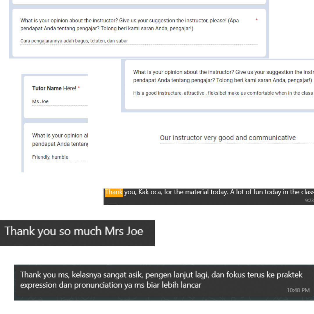Ayo lihat testimoni dari para peserta kursus Remote English yang telah merasakan manfaat dan kemajuan dalam belajar Bahasa InggrisJangan bingung, langsung daftar dan dapatkan promo menariknya!